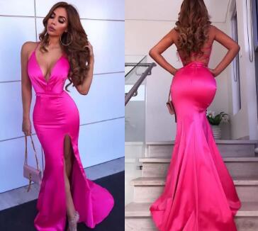 Sexy Hot Pink Mermaid Prom Dresses Deep V Neck Evening Formal Gowns