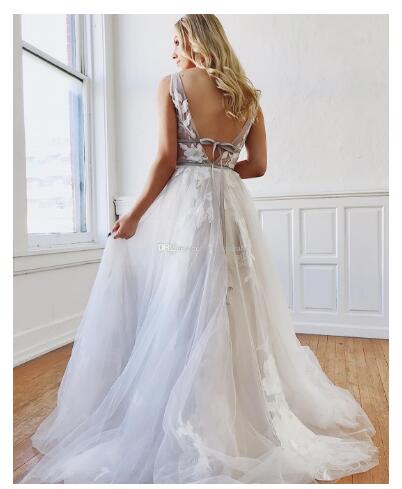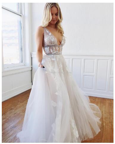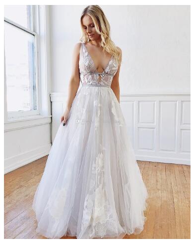 Amazing A Line Beach Backless Wedding Dresses Deep V Neck Appliqued Boho Bridal Gowns Floor Length Tulle Bohemian Vestidos De Noiva