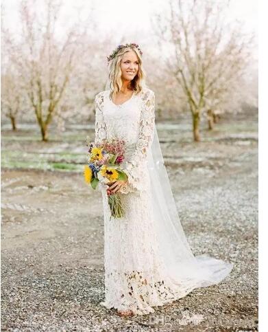 Romantic Boho Wedding Dresses Long Sleeve Neck A Line Full Lace Country Style Bridal Gown Custom Made