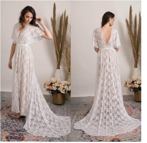 Bohemian Wedding Dresses for Lace Bridal Gowns with Train A Line Backless Beach Wedding Dresses