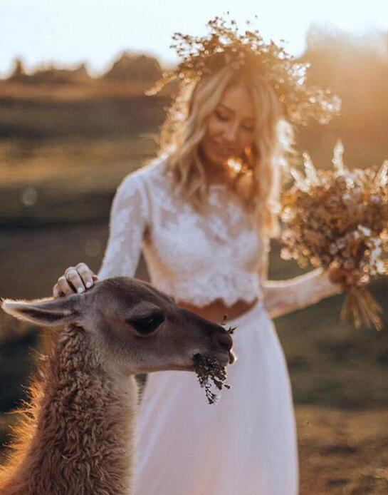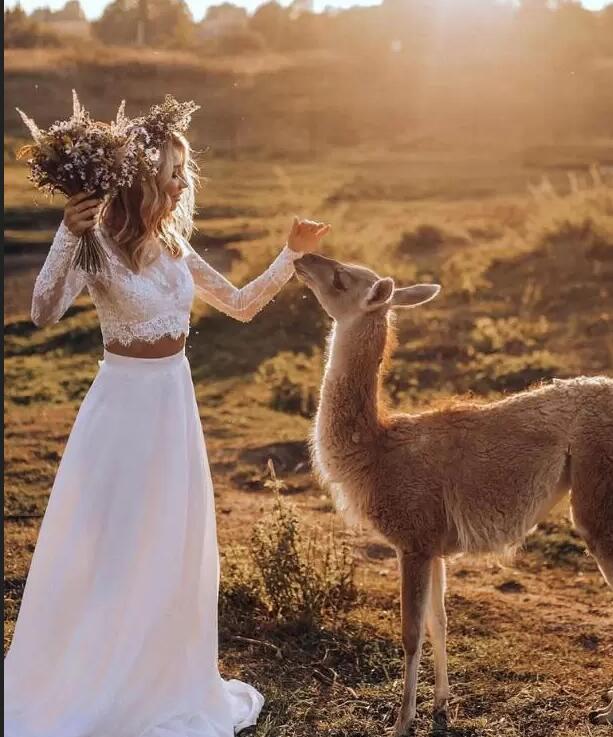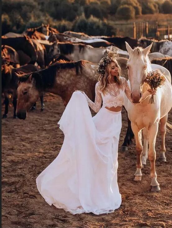 Two Pieces Country Boho Wedding Dress A Line Long Sleeve Lace Applique Bohemian Wedding Gown