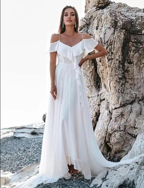 Vintage White Chiffon Ruffles Wedding Dress Summer Long Boho Bridal Gowns 2022 Off The Shoulder Formal Robe De Mariée Open Back