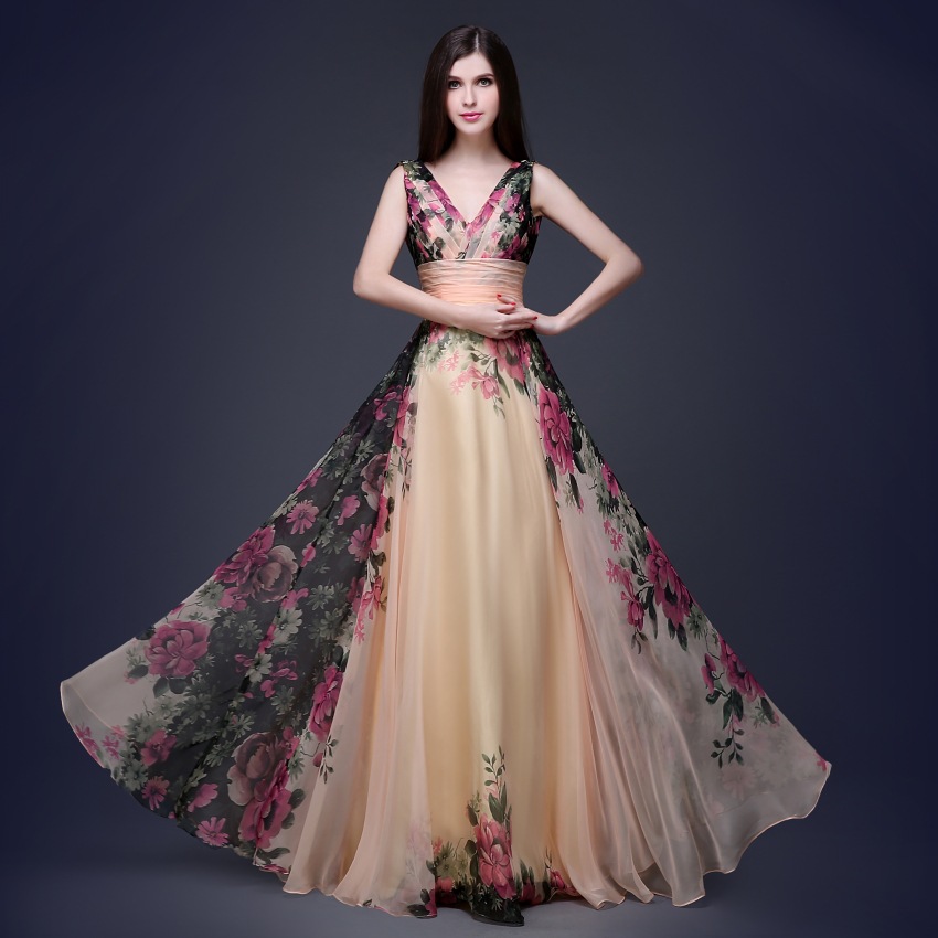 Print Floral A Line Chiffon Deep V Neck Ruched Prom Dresses Evening Formal Gowns