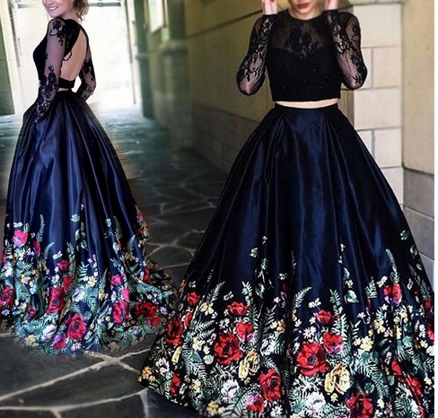 Two Pieces Black Lace Print Evening Dresses Long Sleeves Open Back Sheer Illusion Pleat Ruched Long Pageant Prom Gowns