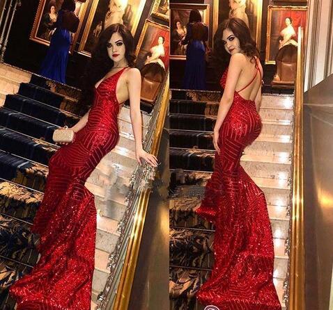 Bling Bling Red Sequins Prom Dresses Sexy Deep V Neck Crisscross Back Mermaid Prom Gowns Long Train Evening Party Dress