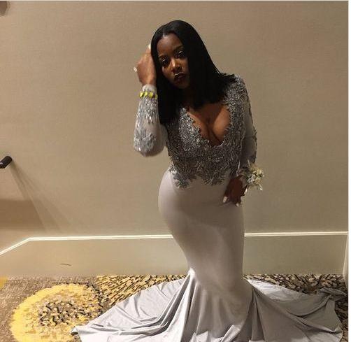 Sexy Deep V Neck Black Girls Long Sleeves Mermaid Prom Dresses Appliques Silver Formal African Evening Gown Party Wear