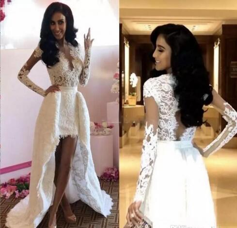Sheath Long Sleeves Wedding Dresses With Detachable Train Sheer Neckline High Low Lace Wedding Dress Sexy Hollow Back Bridal Gowns