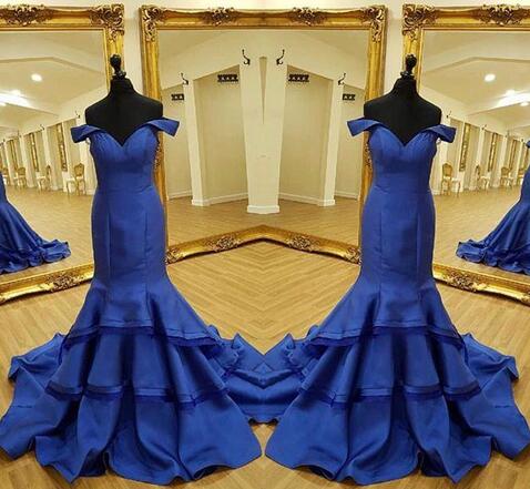 2018 Off The Shoulder Prom Dresses Royal Blue Stain Tiered SKirts Mermaid Formal Evening Dresses Occasion Party Gown Custom Made