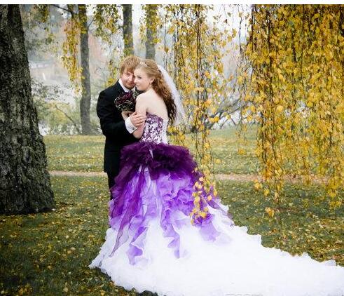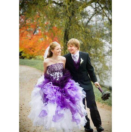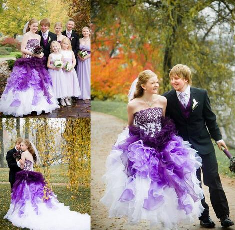 Purple and White Ombre Gothic Wedding Dresses Strapless with Lace and Organza Appliques Cascading Ruffle Chapel Train Ball Gown Bridal Dress