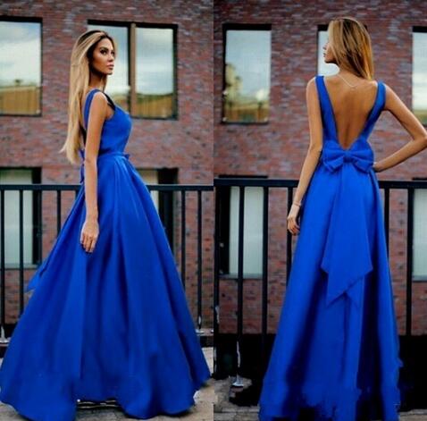 Blue V Neck Prom Dresses A Line Satin Bow Cocktail Dress Formal Evening Party Gowns
