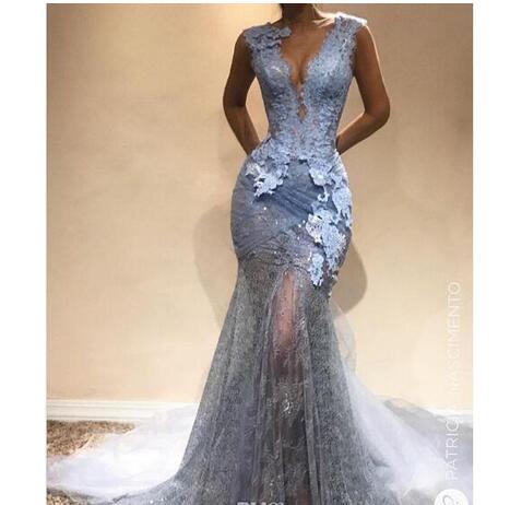 Silver Grey Lace Mermaid Evening Dresses Sexy Deep V Neck Prom Dresses Illusion Party Gowns