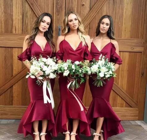 Sexy 2021 Sexy Hater Straps Mermaid Bridesmaid Dresses High-Low Burgundy Maid of Honor Gowns Custom Made Pretty Wedding Guest Dresses