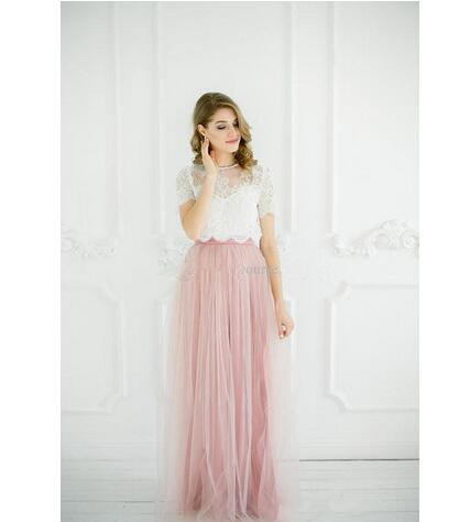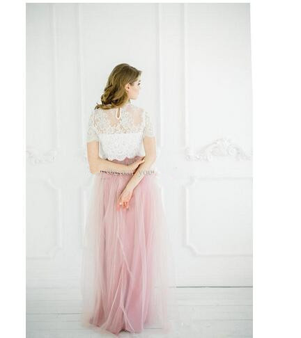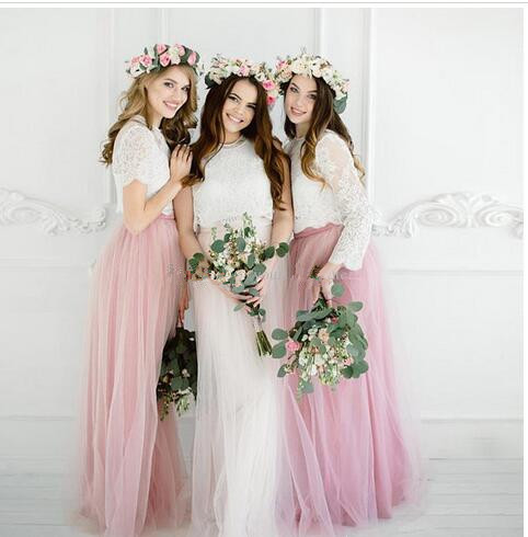 White Pink Boho Bridesmaid Dresses 2021 Lace Top Tulle Floor Length Summer Beach Bridesmaid Gowns Party Dresses Three Pieces