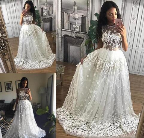 Jewel Sleeveless Wedding Gowns With Lace Applique Sheer Neck Bridal Gowns Tiered Ruffle Custom Made Bridal Gowns