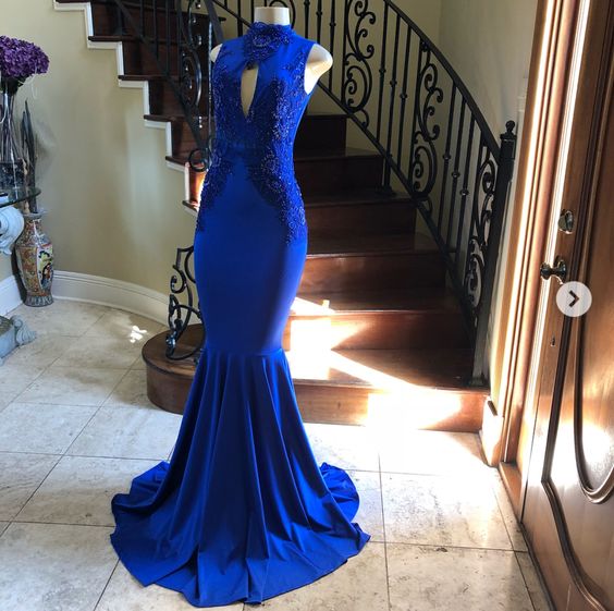 Royal Blue Mermaid Prom Dresses High Neck Cutout Appliques Lace Evening Formal Gowns