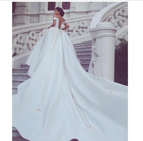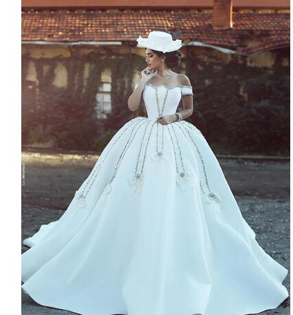High Quality White Ball Gown Crystal Wedding Dresses Off Shoulder Backless with Long Satin Train Custom Made Garden Church Bridal Gowns