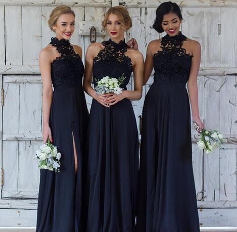 Cheap Navy blue Bridesmaid Dresses for Wedding Long Chiffon A-Line halter split side Formal Dresses Party Lace Modest Maid Of Honor Dress