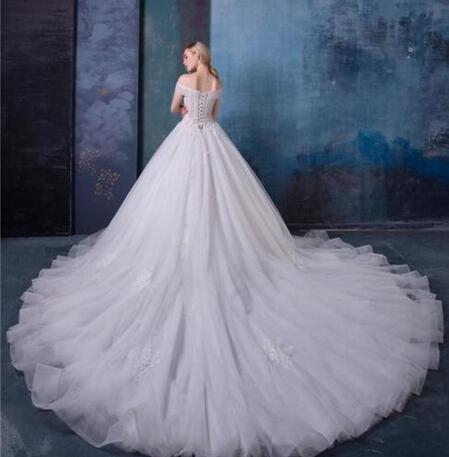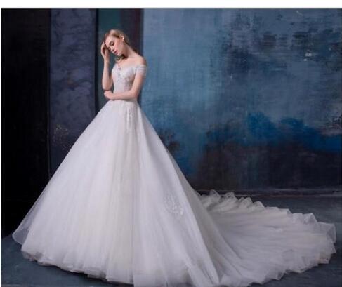 Hight Quality Elegant A Line Wedding Dresses Off The Shoulder Applique Cathedral Train Tulle Lace Dresses Lace Up Wedding Gowns