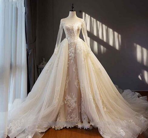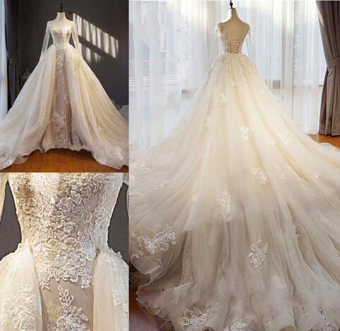 Luxurious Detachable Wedding Dresses Jewel Long Sleeve Lace Appliques Open Back Lace-up Elegant Bridal Dresses Fashion Wedding Gowns