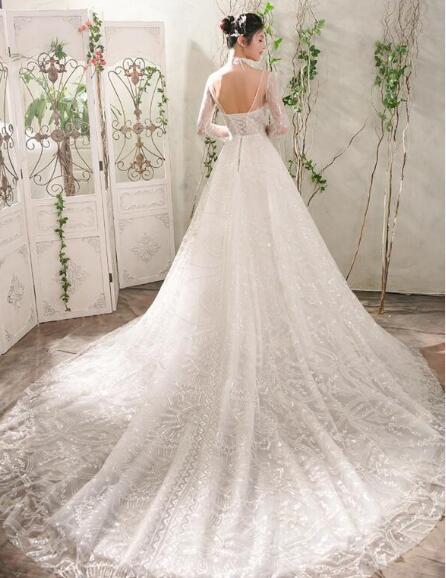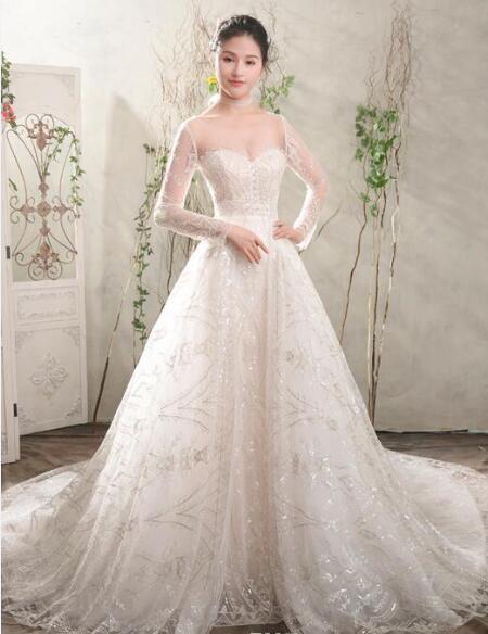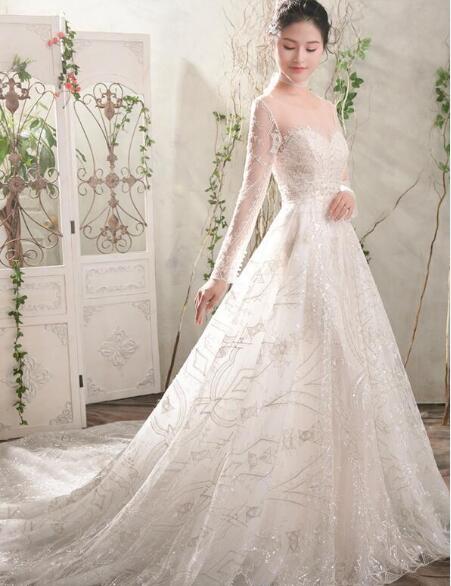 Hight Quality A-Line Wedding Dresses Long Sleeve Applique Cathedral Train Tulle Lace Dresses Lace Up Wedding Gowns