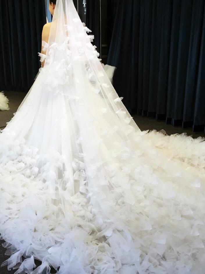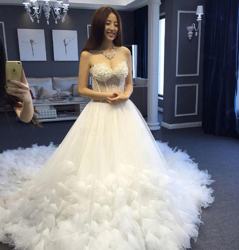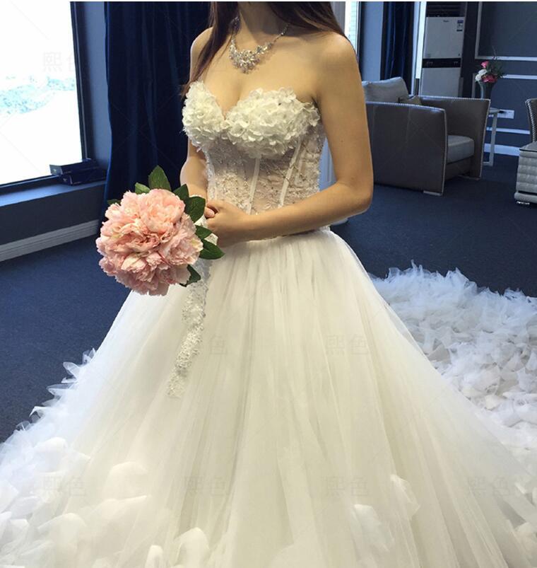 Romatic A-Line Wedding Dresses Sweetheart Sleeveless Lace Up Applique Hand Made Flowers Cathedral Train Tulle Wedding Gowns