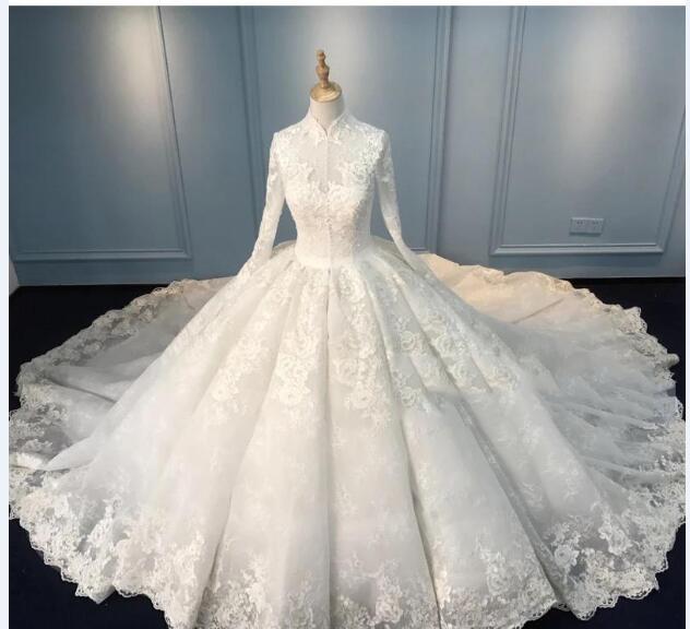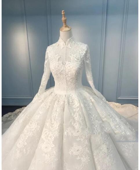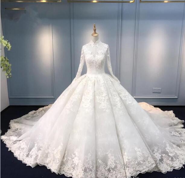 Latest Muslim Wedding Dresses Ball Gown High Neck Long Sleeve Lace Appliques Bridal Dresses Charming Wedding Gowns