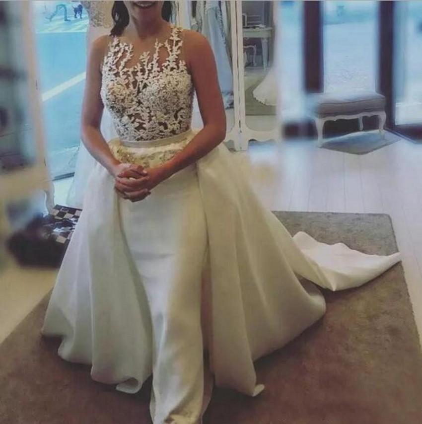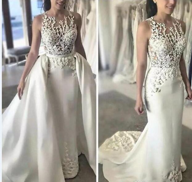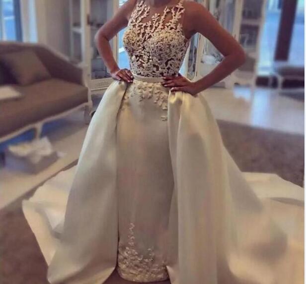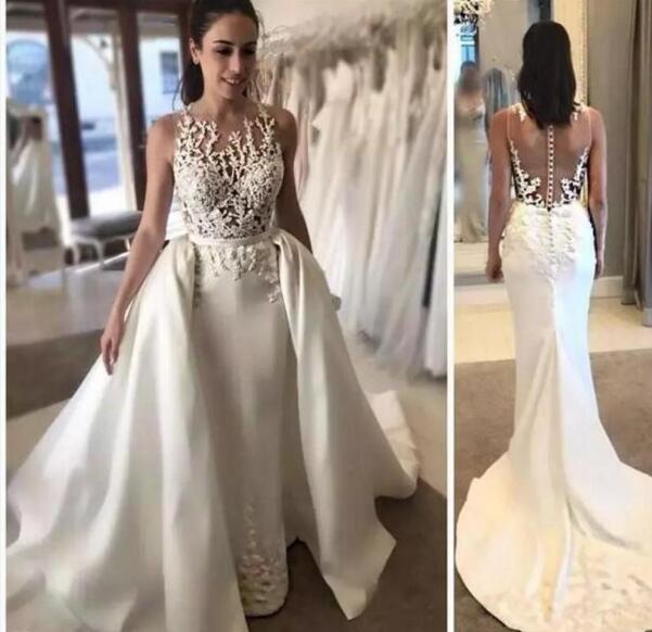 Elegant Wedding Dresses With Applique Sheer Neckline Sleeveless Wedding Gowns With Detachable Train Custom Made Sheer Back Bridal Gowns