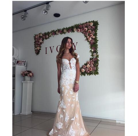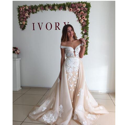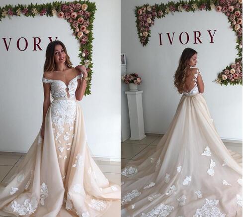 New Arrival Champagne Wedding Dresses with Detachable Train Backless Sexy Off Shoulder Applique Lace Wedding Bridal Gowns Custom Made