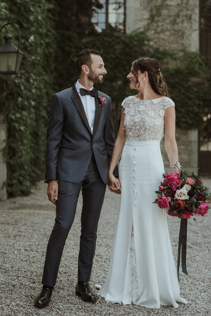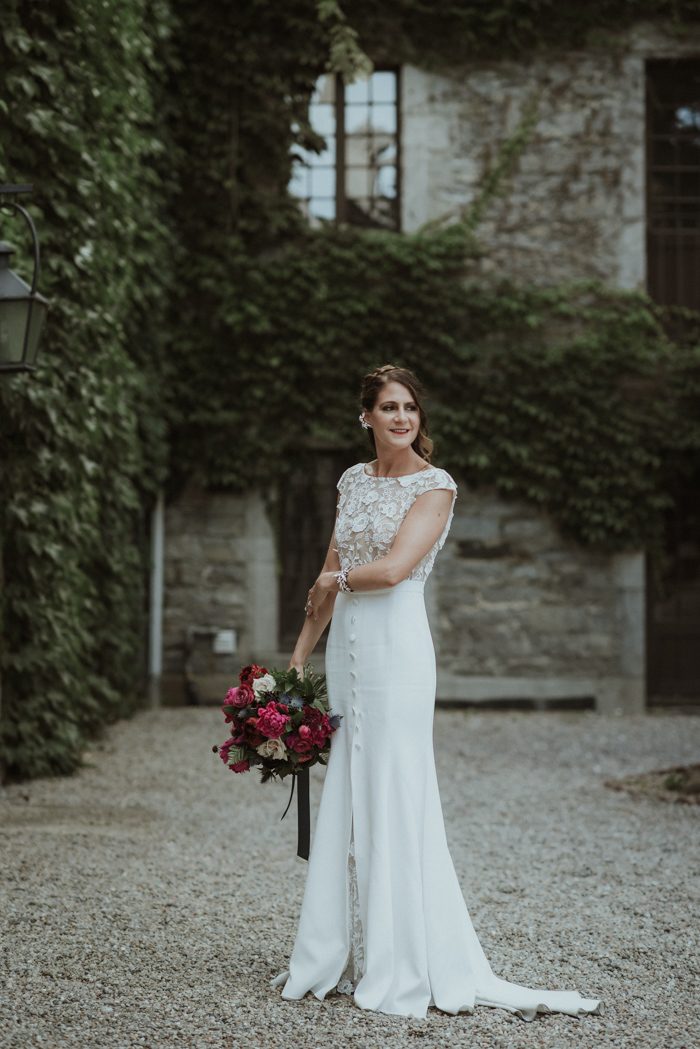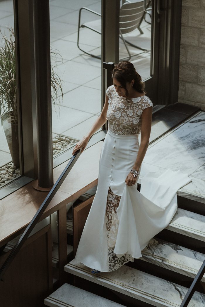Unique Mermaid Garden Wedding Dress Crew Neck Short Sleeve Delicate Lace Sheer Bodice Backless Side Slit Bridal Gowns