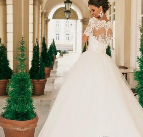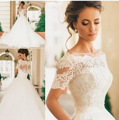 Robe De Mariage Short Sleeves Wedding Dresses Lace Appliqued Pearls Sheer Bateau Neck Vintage Lace Bridal Gowns Vestido De Novia