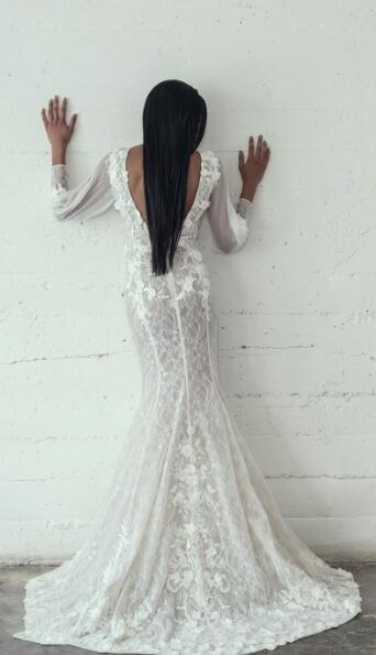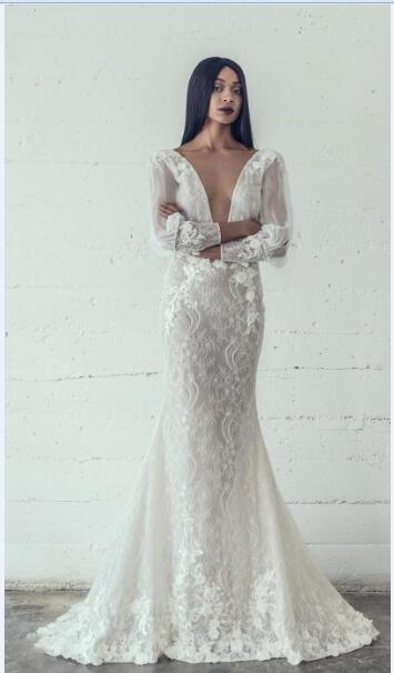 Mermaid Wedding Dresses Sexy Deep V Neck Wedding Dress Full Lace Appliqued Backless Long Sleeves Bridal Gowns