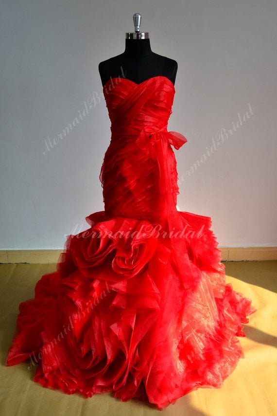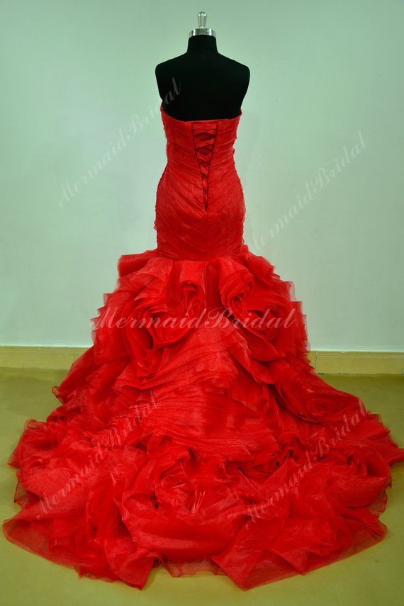 Fit and flare Red organza floral ruffled fomal wedding dress with corset back