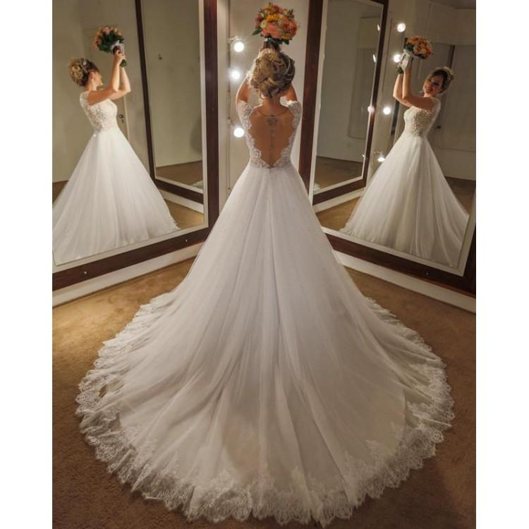 Luxury Wedding Dresses A Line Deep V Neck Sweep Train Bridal Gowns Lace Appliques Sequins Illusion Back With Button Plus Size Wedding Gowns
