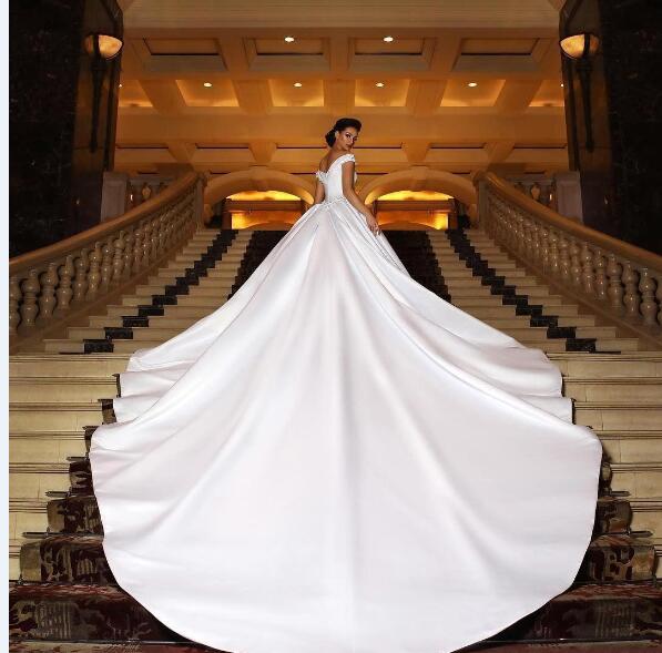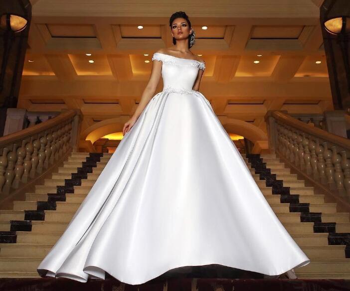 Gorgeous Arabic A Line Country Wedding Dresses Long Train Off the Shoulder Lace Appliqued Satin Wedding Bridal Gowns