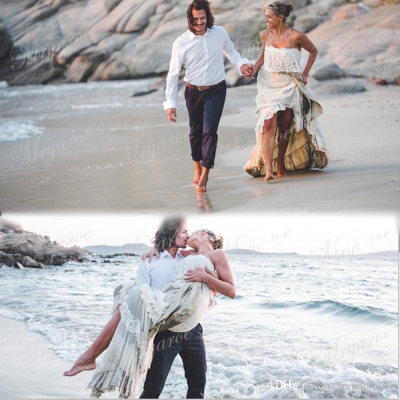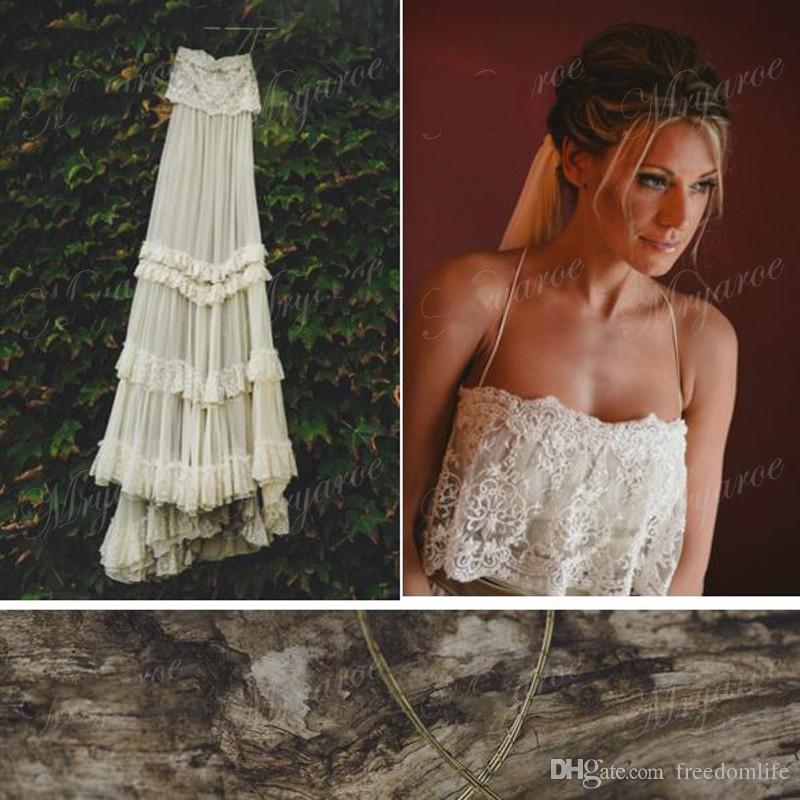 Vintage Hippie Style Boho Beach Wedding Dresses Sexy Spaghetti Straps Tiered Lace Chiffon A Line Gybsy Bridal Gowns