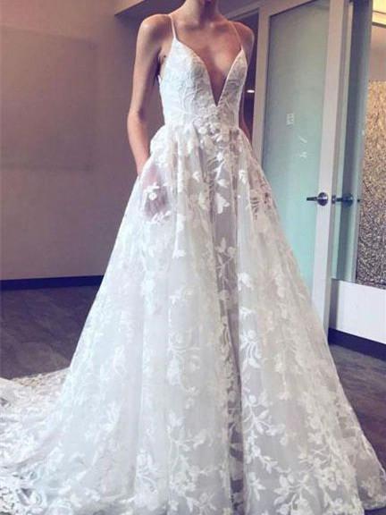 Sexy Lace Spaghetti Straps Neckline A-line Wedding Dresses With Pleats