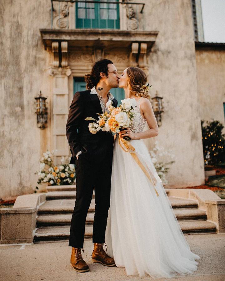 Sparkly Tulle V-neck Neckline A-line Wedding Dresses With Pearls