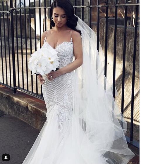 Stunning Mermaid Wedding Dresses Spaghetti Straps Delicate Lace Bridal Gowns