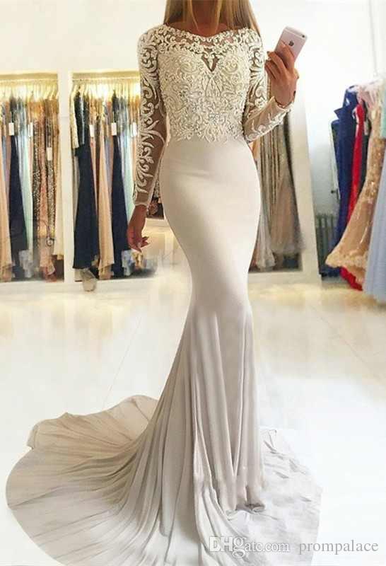 Elegant White Lace Mermaid Prom Dresses Scoop Neck Long Sleeves Appliques Dresses Long Formal Party Evening Dresses