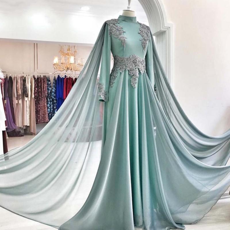 Muslim Long Sleeves Prom Dresses Dubai A-Line Chiffon Beading Lace Applique Vintage Long Evening Dress High Neck Glamorous Party Gowns