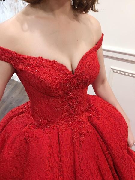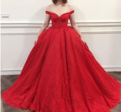 Red Lace Ball Gown Prom Dresses Sexy Vestido de Noiva Beaded Appliques Lace Long Evening Gowns 2019 Off Shoulder Sleeveless Party Gown