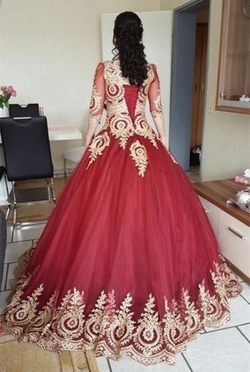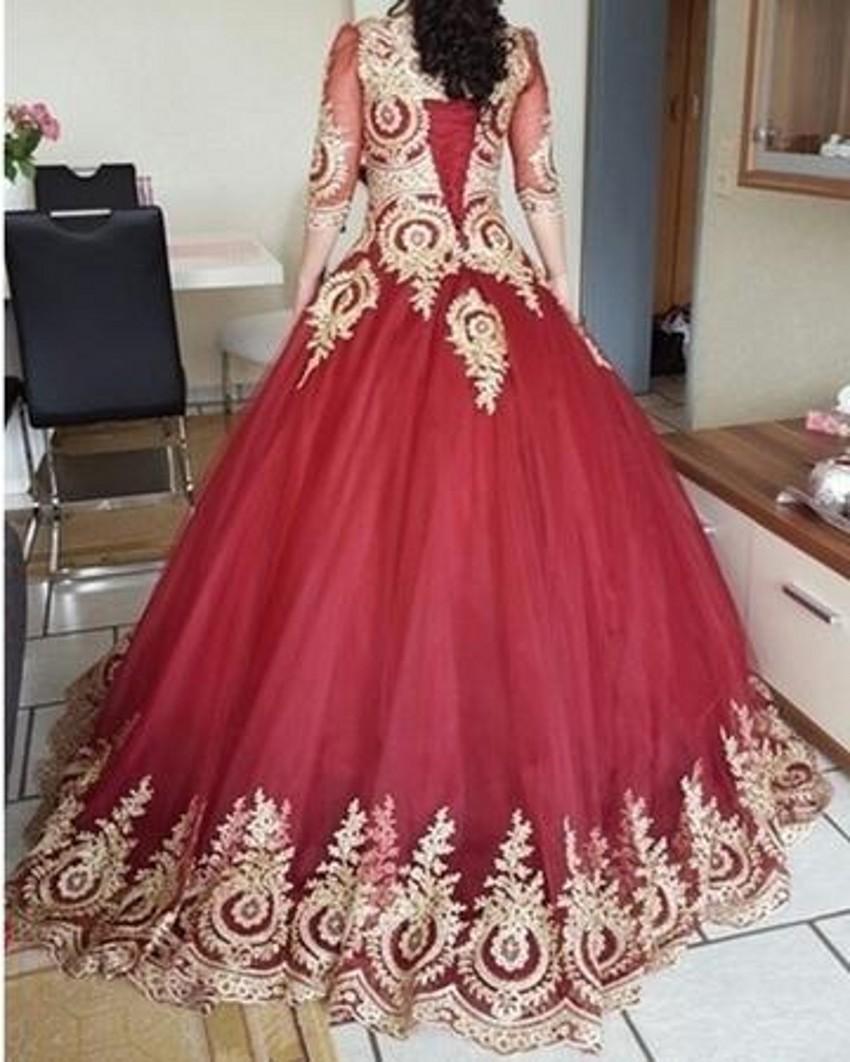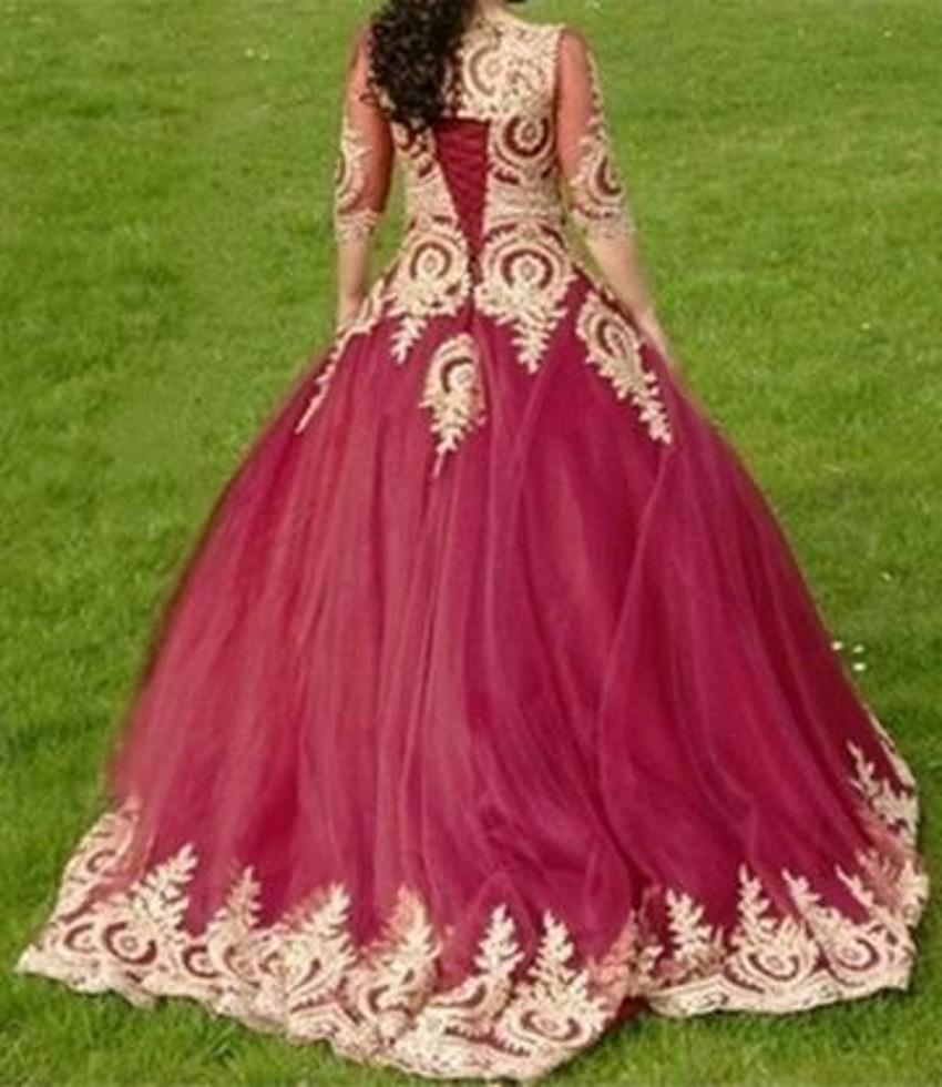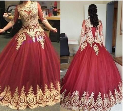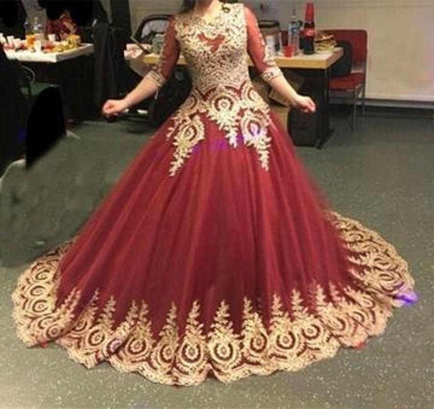 Retro Prom Dresses Modest 3/4 Sleeves Burgundy Ball Gowns Gothic Prom Dresses Gold Lace Appliques Vintage Party Dresses