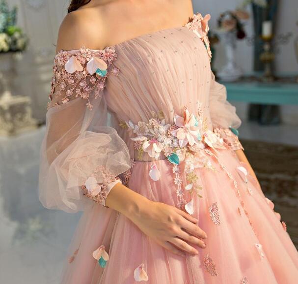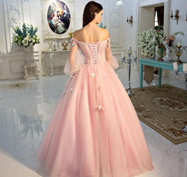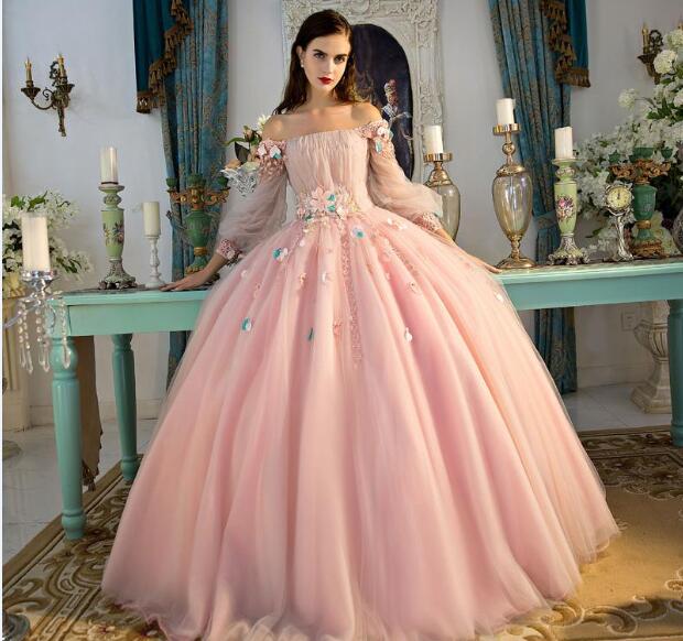 Graceful Pink Ball Gown Prom Dresses Long Sleeve Lace Appliques Lace-up Special Occasion Dresses Sweet Design Evening Dresses