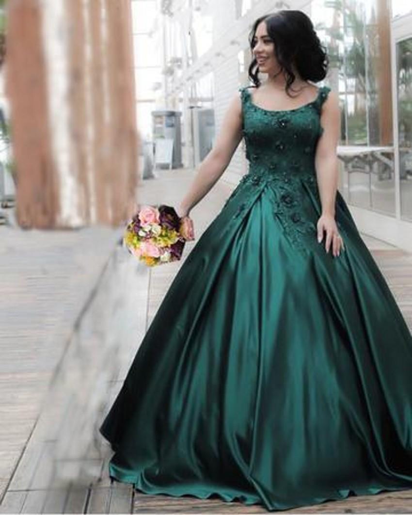 Latest Fashion Prom Dresses Scoop Neck Lace Flowers Embroidery Satin Ball Gowns Floor Length Engagement Evening Dress