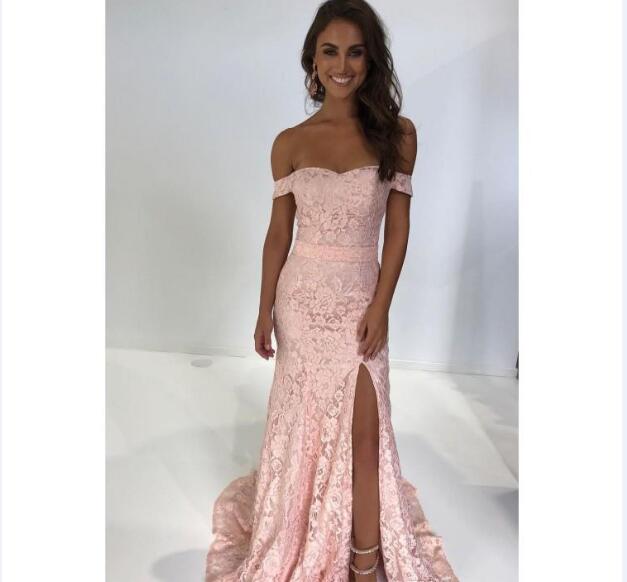 Elegant Pink Side Split Mermaid Prom Dresses Off The Shoulder Sexy Back Sweep Train Prom Gowns Evening Dresses