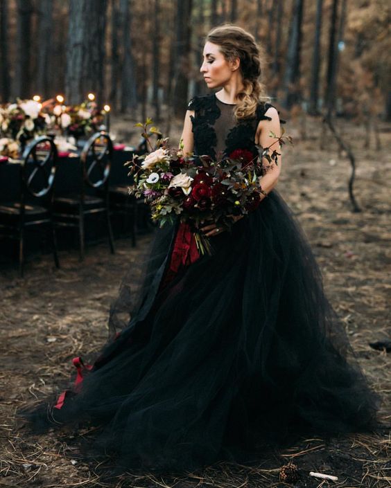 Giothic Bohemian Lace Black Wedding Dresses 3Crew Neck Lace Bodice Beach Bridal Gowns Wedding Dress