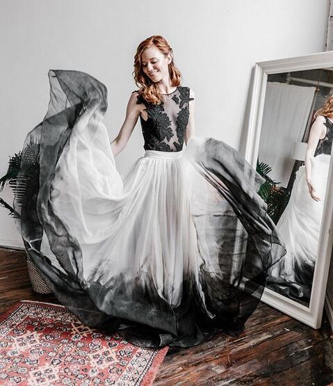 Ombre Bohemian Lace Black Wedding Dresses 3Crew Neck Lace Bodice Beach Bridal Gowns White and Black Wedding Dress