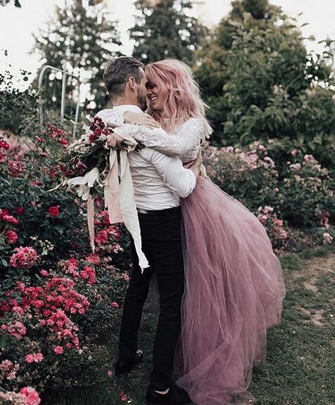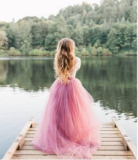 Ball Gown Tulle Wedding Dresses Scoop Sheer Long Sleeve Lace Bodice Puffy Light Purple Skirt Bridal Gowns