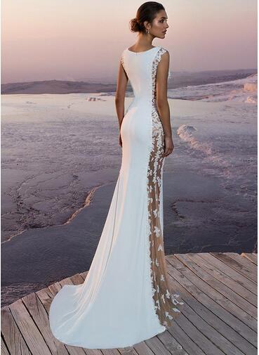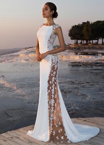 Fabulous Stretch Chiffon Bateau Neckline See-through Mermaid Wedding Dress With Beaded Lace Appliques