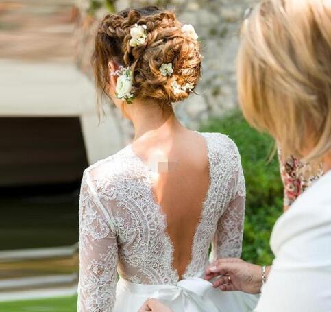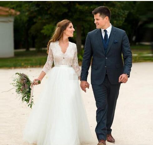 Newest Beach Wedding Dresses 3/4 Long Sleeves Scalloped V Neck Floor Length Tulle Ribbon Lace Applique Floor Length Wedding Gowns
